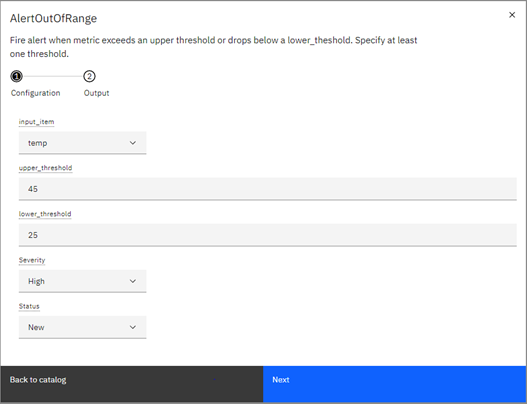 This function will generate an Alert when a metric exceeds an upper threshold or goes below a lower threshold. It is as simple as selecting the data element within your data stream, the upper and lower thresholds, and the severity you wish the Alert to be. Further, you can give the metric(s) a specific name.