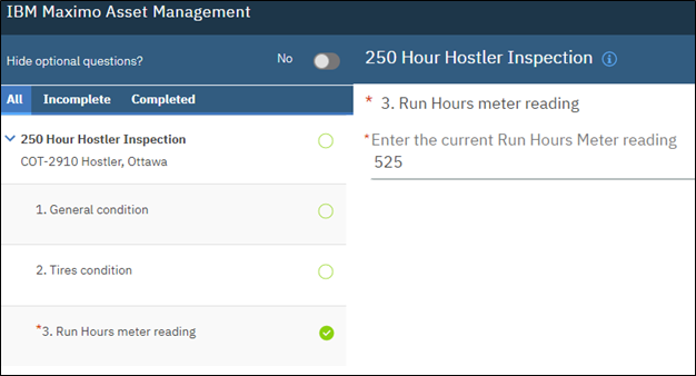 When the form is used for an inspection, if the Meter definition referenced in the form is not also active on the Location or Asset, the Inspector will see an error message. The inspection can continue without the Meter reading (if the question is not required!). If the Meter definition is active on the Asset or Location record, then the Inspector can simply enter the reading. Further, if the entered value is below the previous reading value, a message will appear as well, indicating a problem with the reading.